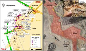 "Okay, the map on the left shows you the footprint, that brown line shows you the footprint of areas that they recently opened up through trenching. The kind of darker colour areas, those were the previous trench areas, the company has been very aggressive about opening up and exploring this target more and more. The drill holes that we talked about a few weeks ago came out of that Lynx Zone, which is kind of the southern blob of the two here -- but what is really really cool is as they open up the ground between these two areas they are seeing high-grade occur throughout and this is just absolutely one of them, this is the kind of stuff that leads to a major gold discovery. You can see the photograph over on the right here, you can see the footprint of the trench here, my gosh that is almost the size of an opencast mine at this point -- its phenomenal. They are seeing quartz visible gold in many places. This is the kind of gold system, it is a high level orogenic system, episomal [? audio transcription] likely, but it also might have aspects of an earlier epithermal style of mineralization. I talked about this in the original presentation, it's really intriguing. The other thing to keep in context here is that this system is part of the same belt, if you will, that extends up into Newfoundland in which companies like New Found are finding very high-grade discoveries. So I am very very intrigued with what these guys are seeing, the high-grades tell me, and the textures tell me, they are in a high level part of the system. I think it is ripe for the discovery of a substantial high-grade deposit. So stay tuned. I think they have a lot of drill holes in the works right now and the labs are getting assays, they have many more samples -- you can see the little black X's on this map. Usually when there is a high density of sampling, a clustering of samples, it's for good reasons -- because the geologists are seeing rock in that area that's worthy of sampling. I anticipate a lot more high-grade results to come from this new exciting discovery."