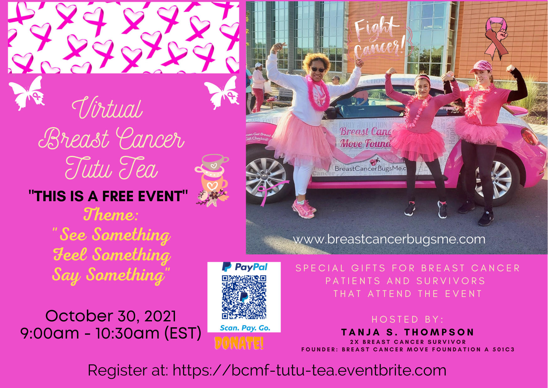 This year the Breast Cancer Move Foundation is hosting a “FREE” Virtual Breast Cancer Tutu Tea, Saturday, October 30, 2021, from 9:00 am to 10:30 am (EST).