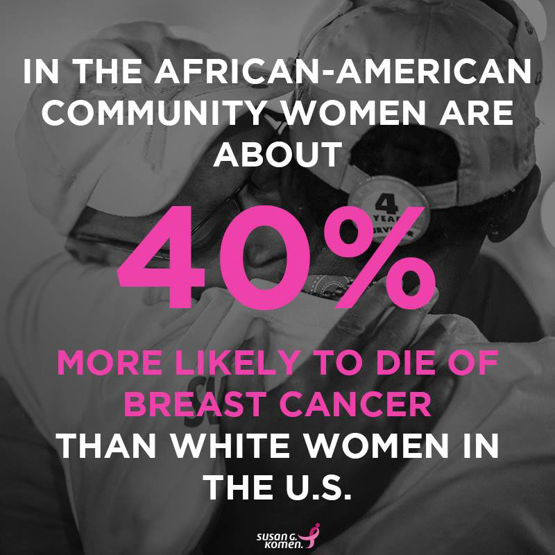 *African American women are 40% more likely to die from breast cancer and twice as likely to die if they are 50 or older.