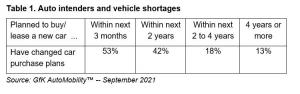 Auto "intenders“ – consumers who are planning to buy or lease a new car – have very different reactions to the shortages, depending on when they intend to buy. Half (53%) of all intenders who expected to buy or lease within the next three months have changed their plans. The proportion drops slightly, to 42%, among those intending to get a new car in the next two years, and levels fall off steeply from there. (See Table 1.)