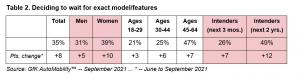 Even “near-term“ intenders – those planning to buy or lease within the next three months – are now more likely to wait for the car of their dreams, with 26% saying they will adopt this strategy, compared to 18% in June. The same option for intenders with a purchase window of up to two years has grown 12 points, from 37% to 49% -- although levels held steady in many demos from August to September.