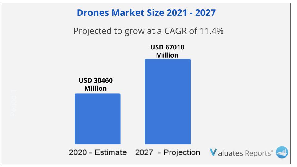 BENGALURU, KARNATAKA, INDIA, October 26, 2021 /EINPresswire.com/ -- In 2020, the global Drones market size was US$ 30460 million and it is expected to reach US$ 67010 million by the end of 2027, with a CAGR of 11.4% during 2021-2027.Rising demand for drones in military applications, advanced development in drones, and its growing applications in various sectors are some of the major factors driving the growth of the global drone market.