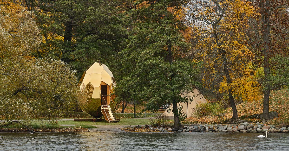Prize-winning golden sauna and sculpture, Solar Egg, visits the Swedish capital