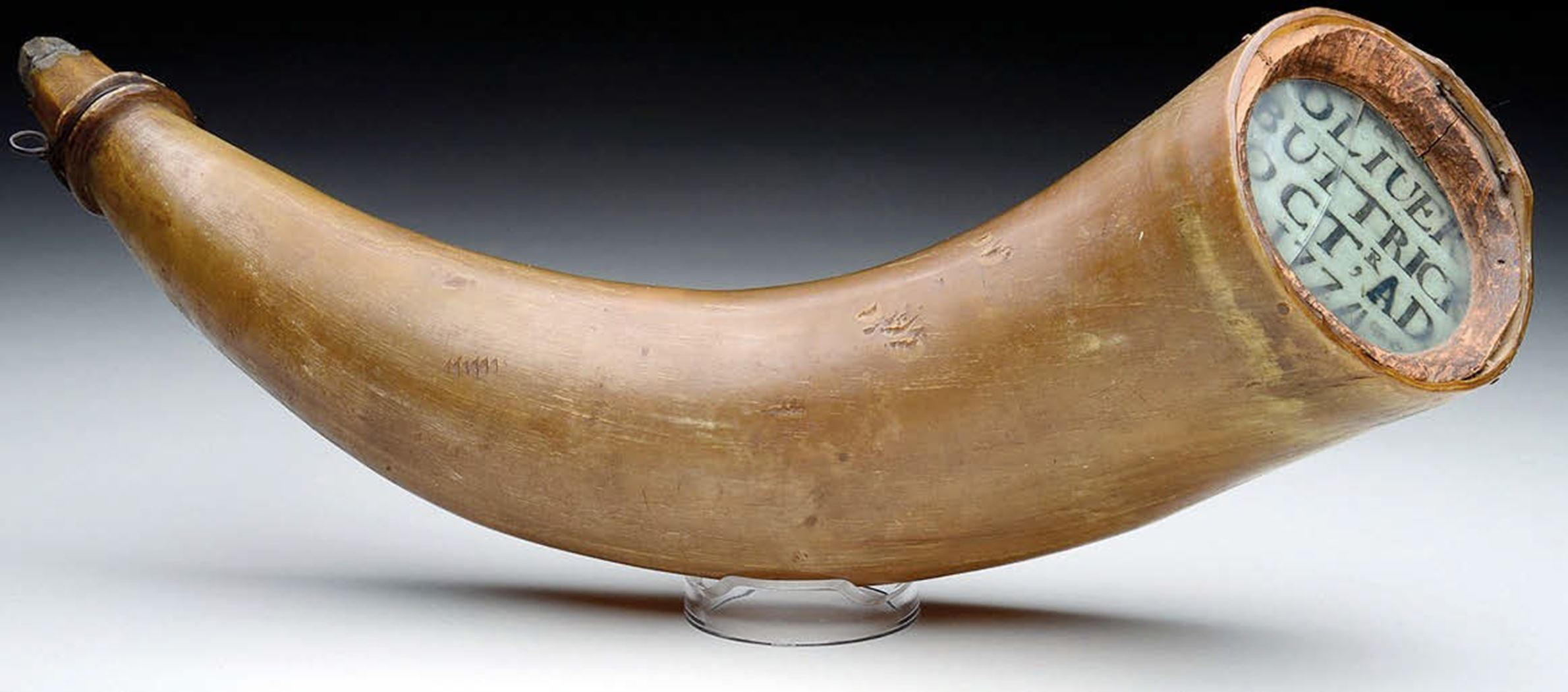 Powder horn belonging to 18-year-old minuteman Oliver Buttrick and used at the Battle of Concord in 1775, a remarkable relic of the Revolutionary War (estimate: $90,000-$100,000).