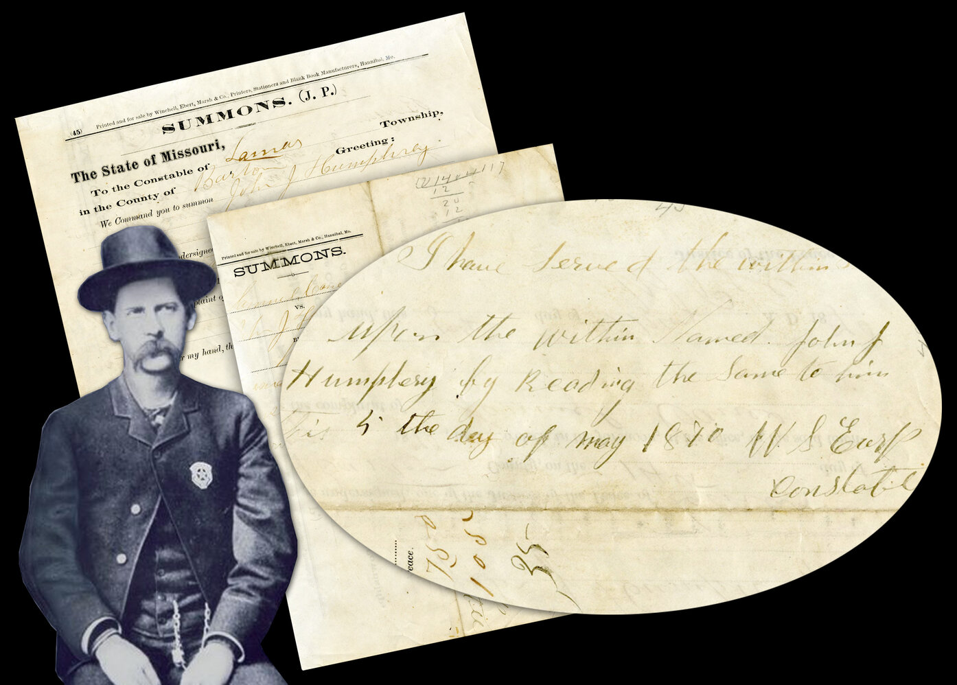 A summons personally endorsed by Wyatt Earp, then just 21 years old and on his first job in law enforcement, as constable of Lamar, Missouri, in May 1870 (estimate: $30,000-$35,000).