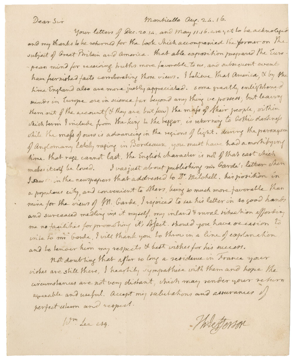 A one-page autograph letter signed by Thomas Jefferson, in superb condition, touting America’s superiority over Europe, written to American diplomat William Lee, contains stellar content and is expected to change hands for $25,000-$30,000. Also on offer is a rare and beautiful white Chinese Export porcelain dessert bowl from Jefferson’s White House service, circa 1790s, with 13 gold stars encircling the elegant “J” monogram at the center (estimate: $10,000-$12,000).