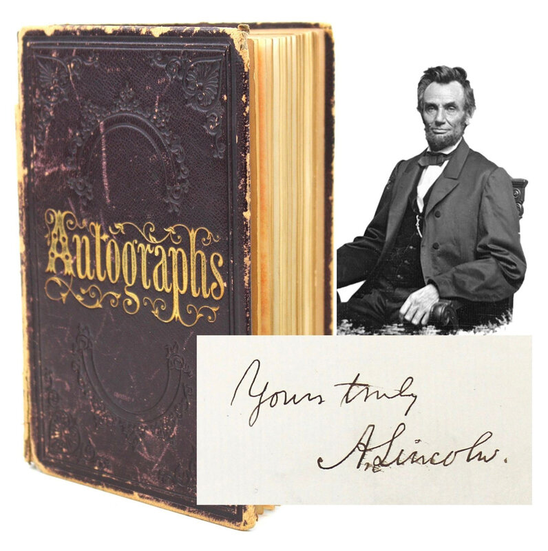 A Civil War-dated autograph album compiled by a correspondent of Treasury Secretary Salmon P. Chase contains 180 signatures of Lincoln administration officials and members of the 37th U.S. Congress, including President Abraham Lincoln himself and six current and future Lincoln cabinet members (Seward, Chase, Welles, Stanton, Smith and Fessenden). It is estimated to fetch $20,000-$24,000.