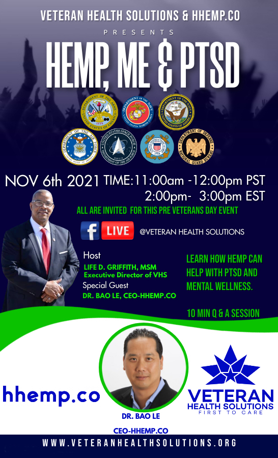 Join Life Griffith and Dr. Bao Le for their upcoming event, “Hemp, Me and PTSD”, on Saturday, November 6, 2021 at 11AM PST for a virtual 1 hour event, which will be a great forum to get questions answered about the plant based approach as an alternative option toward wellness. This event will be broadcast on Facebook Live via the Veteran Health Solutions page. Please click here to visit the VHS Facebook page.