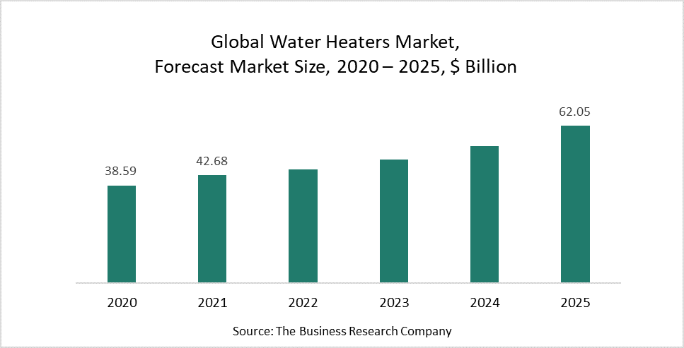 The global water heaters market size is expected to grow from $38.59 billion in 2020 to $42.68 billion in 2021 at a compound annual growth rate (CAGR) of 10.6%. The growth is mainly due to the companies rearranging their operations and recovering from the COVID-19 impact, which had earlier led to restrictive containment measures involving social distancing, remote working, and the closure of commercial activities that resulted in operational challenges. The water heaters market is expected to reach $62.05 billion in 2025 at a CAGR of 10%