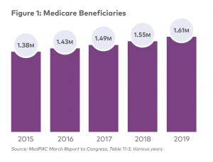 1.61 million Medicare beneficiaries received hospice care in 2019, an increase of 3.9 percent from the previous year. Utilization of the hospice benefit remains slightly higher among individuals enrolled in Medicare Advantage (MA) plans than among traditional Medicare users, while the trendline for hospice usage continues to increase in both groups. MA enrollees who utilized the hospice benefit rose from 51.1 percent in 2015 to 53.2 percent in 2019. During the same period, traditional Medicare beneficiaries utilizing the hospice benefit rose from 47.6 percent of Medicare decedents in 2015 to 50.7 percent in 2019.