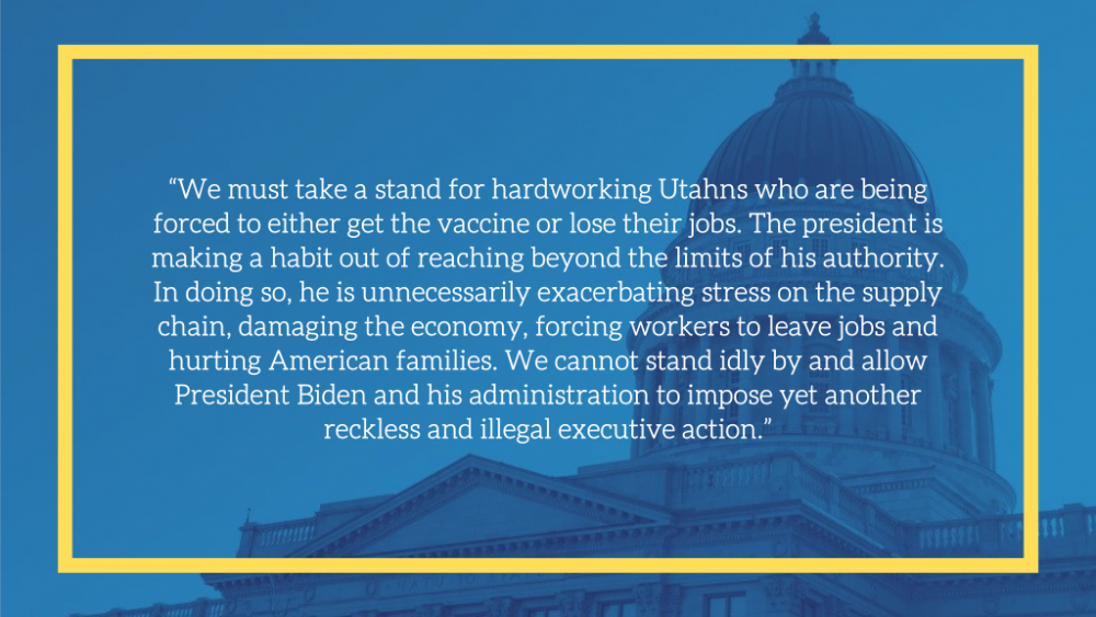“We must take a stand for hardworking Utahns who are being forced to either get the vaccine or lose their jobs. The president is making a habit out of reaching beyond the limits of his authority. In doing so, he is unnecessarily exacerbating stress on the supply chain, damaging the economy, forcing workers to leave jobs and hurting American families. We cannot stand idly by and allow President Biden and his administration to impose yet another reckless and illegal executive action.”