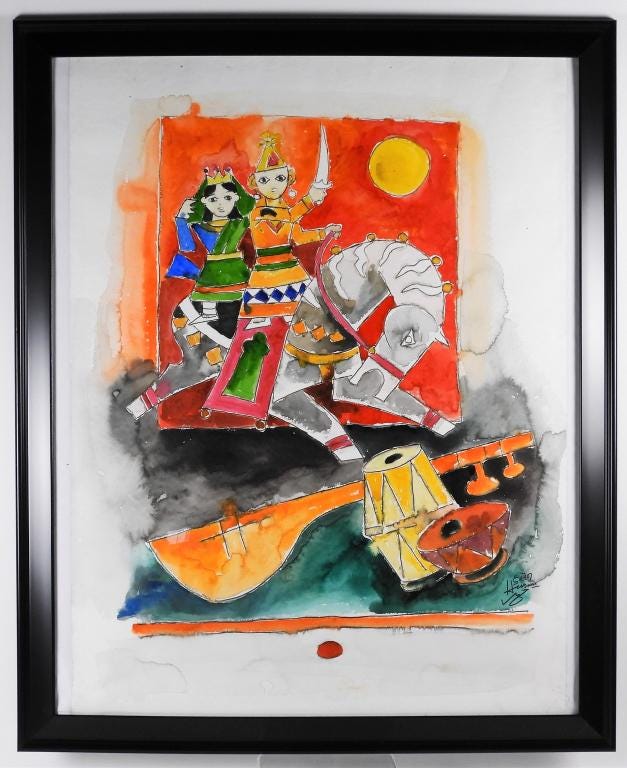 The Husain painting is a Cubist figural watercolor depicting a man and woman in bright polychromatic outfits on the back of a white horse. Housed in a 33 inch by 27 inch frame, the painting should reach $10,000-$15,000. It comes with a certificate of authenticity. Dubbed “the Picasso of India," Husain started off painting billboard signs in India but quickly developed his own style by blending together folk, tribal, and mythological arts.
