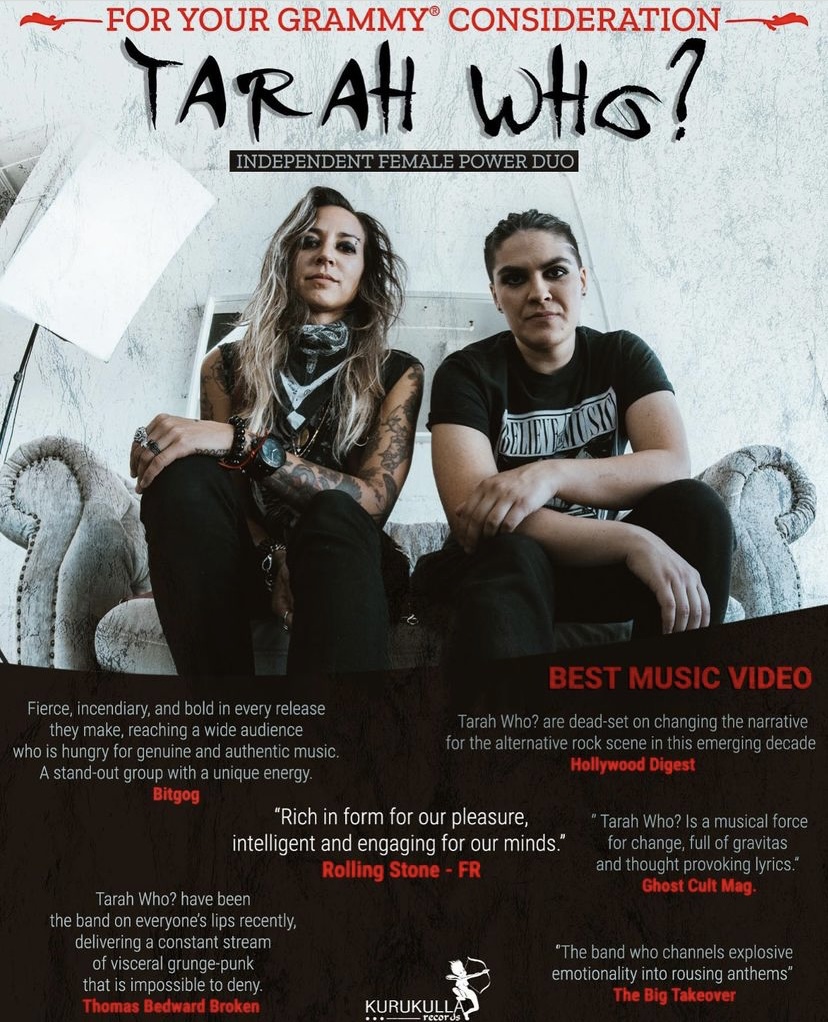 LOS ANGELES , CALIFORNIA, UNITED STATES, November 1, 2021 /EINPresswire.com/ -- The talented rock duo, Tarah Who?, is officially in the first round of Grammy consideration for ‘Best Music Video’ for their video ‘Supposedly a Man’!