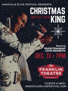 Nashville Elvis Festival has also announced the return of Christmas with the King: A Holiday Tribute to Elvis, to be held on Monday, December 13, 2021 at the historic Franklin Theatre. This family-friendly holiday extravaganza stars world champion Elvis tribute artist Cote Deonath with the David Fontana Band (David is the son of Elvis’ drummer DJ Fontana!), and features costume changes, a visit by Santa Claus and 25 of the King's biggest hits and Christmas classics.