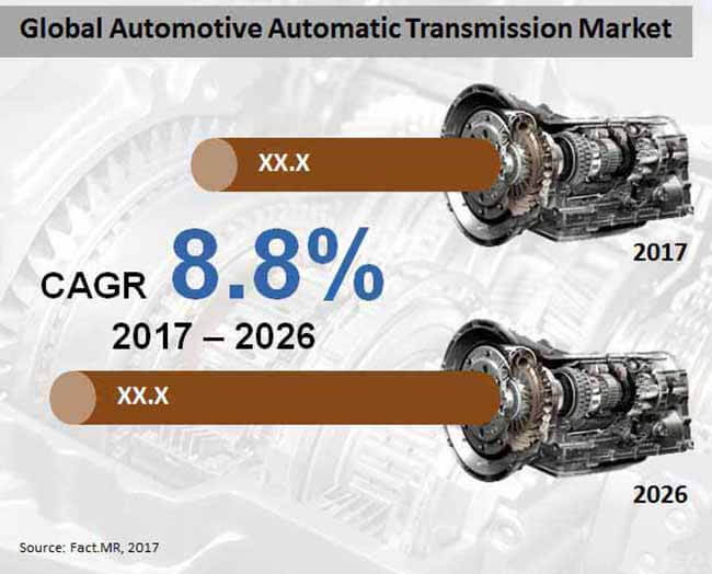 Fact.MR’s latest forecast study observes that global automotive automatic transmission market is pegged to expand at a robust pace during the period, 2017-2026. Key findings from the report reveal that the global automotive automatic transmission market will register a volume CAGR of 8.2% over the forecast period. The report further estimates that by the end of 2026, the global market for automotive automatic transmission will touch an estimated valuation of US$ 5 Bn.