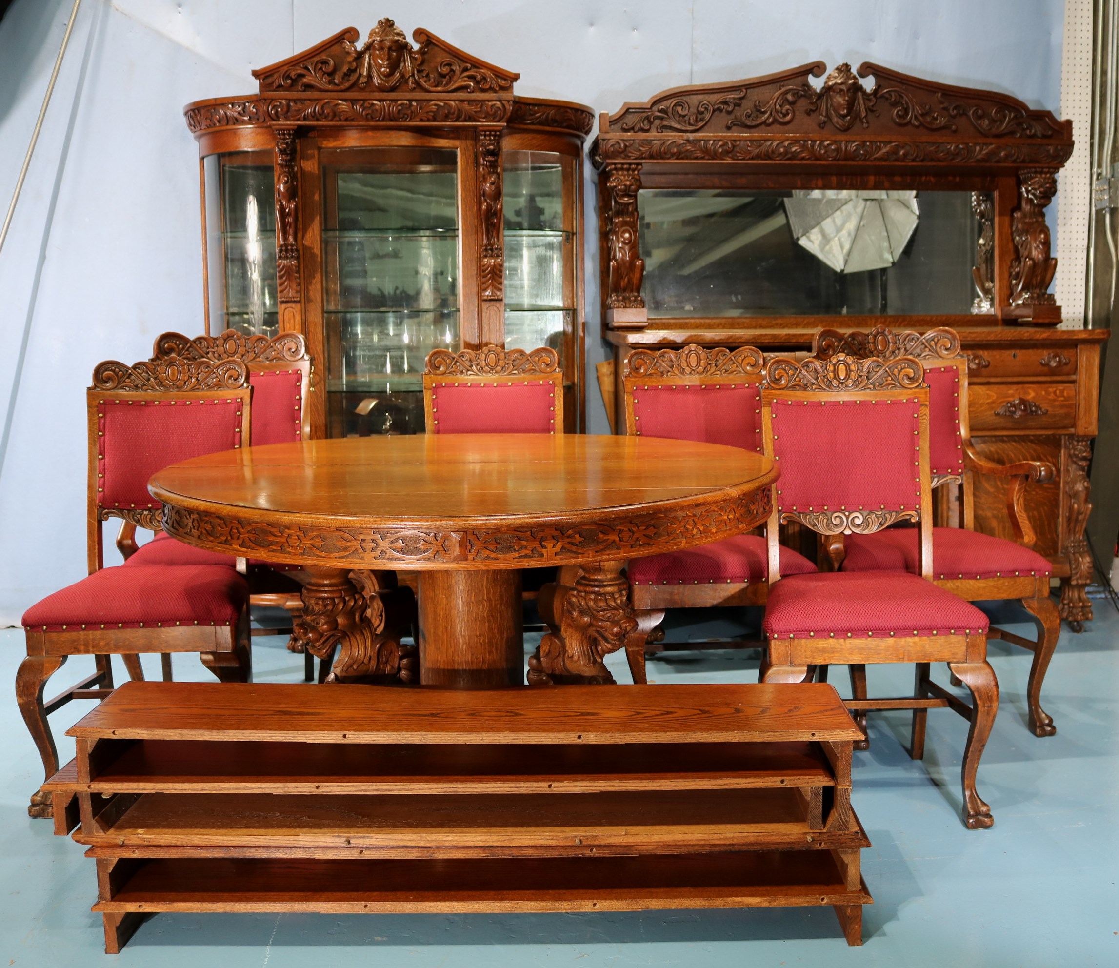 Gorgeous R. J. Horner dining room suite with a china cabinet, banquet-size table with five leaves, six chairs and sideboard, carved with wing griffins and feet. (estimate: $15,000-$45,000).