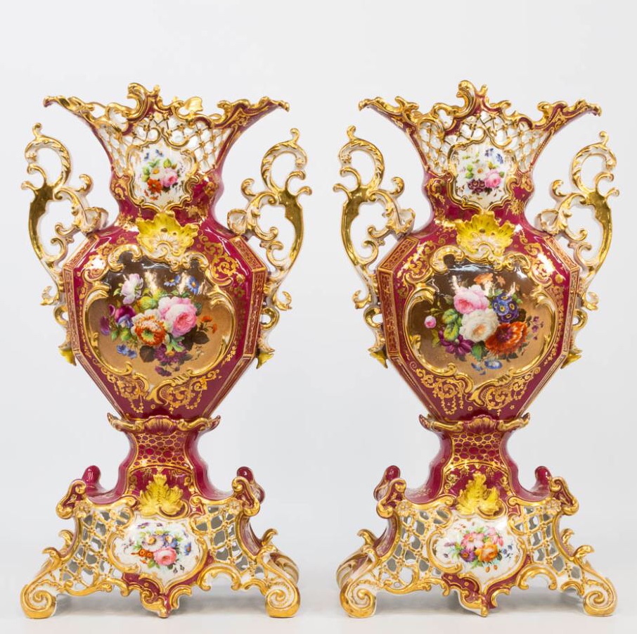 Magnificent pair of early 19th century Old Paris vases, museum deaccessioned 50 years ago, with lattice work from top to bottom and breathtaking painting, like new (estimate: $5,000-$15,000).
