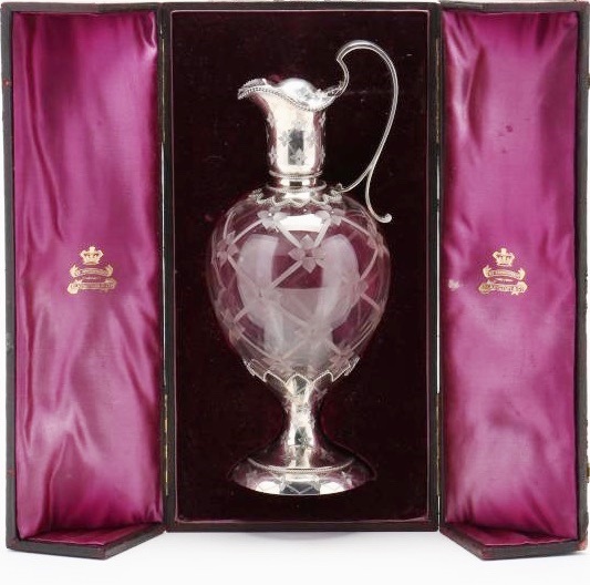 Need something to house (or lift) your spirits? An important silver and cut glass 12-inch-tall wine vessel in the original silk-lined case, with insignias by Appointment to King, Elkington and Company, with hallmarks, should finish at $2,500-$5,000; while a Napoleon III Boulle inlaid 20-piece set of gold gilt decanters and wines, probably Baccarat, should hammer for $1,000-$1,500.