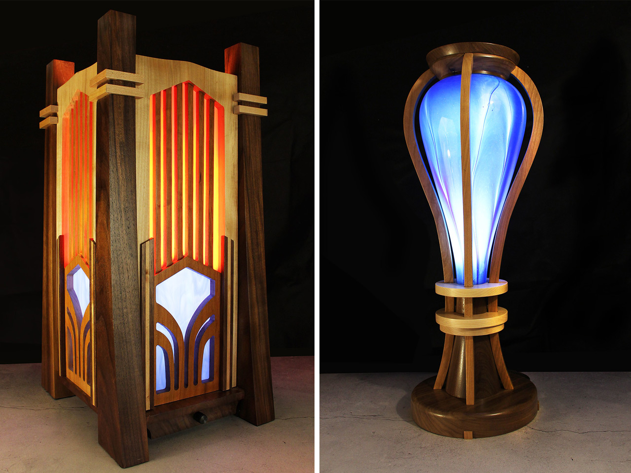 The collection can be separated into two general categories: accent lighting and task lighting. Among the accent pieces, “Deco Cathedral” is a fine example of the merging of Art Deco design with Arts and Crafts craftsmanship. Inspired by the beautiful Art Deco radios of the 1920s and 30s, the Deco Cathedral lamp’s towering appearance utilizes layers of maple and cherry to amplify the feeling of depth, while tapered walnut columns create an edifice with presence. “Rising Bubble”, another stunning accent piece, is highly sculptural and features an evocative curve of unique hand-blown glass, implying upward motion, centered between octopus-like arms, which seem to squeeze and pull away. When lit, the glass reveals beautiful organic swirls.
