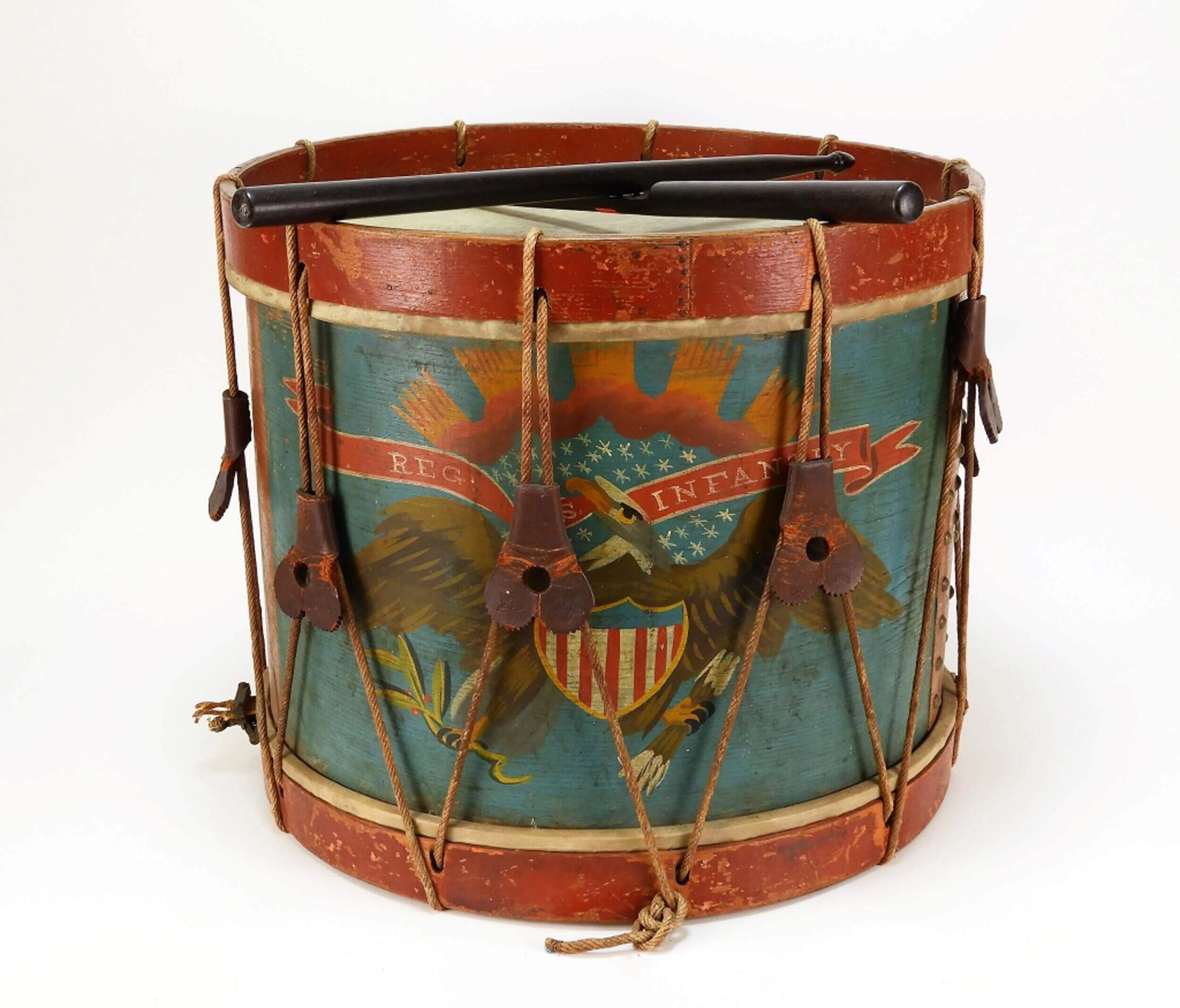 A circa 1864 Civil War regulation painted rope tension drum, with the original rope and nine original leather ears, plus a pair of sticks, is estimated to fetch $2,000-$3,000. The drum has red-painted upper and lower hoops, a shell painted blue with an eagle, shield, sunburst, and banner marked "REGT./U.S./ INFANTRY," with brass tacks around the vent. A paper label inside the shell indicates it was made by Vogt Mfg. (Philadelphia).