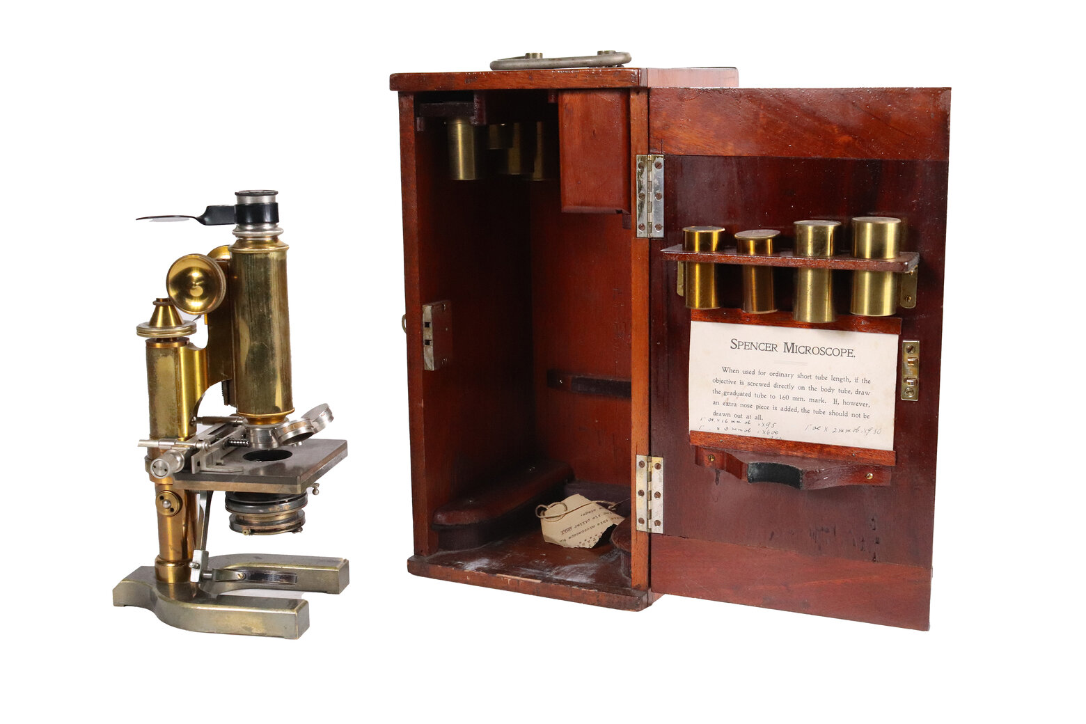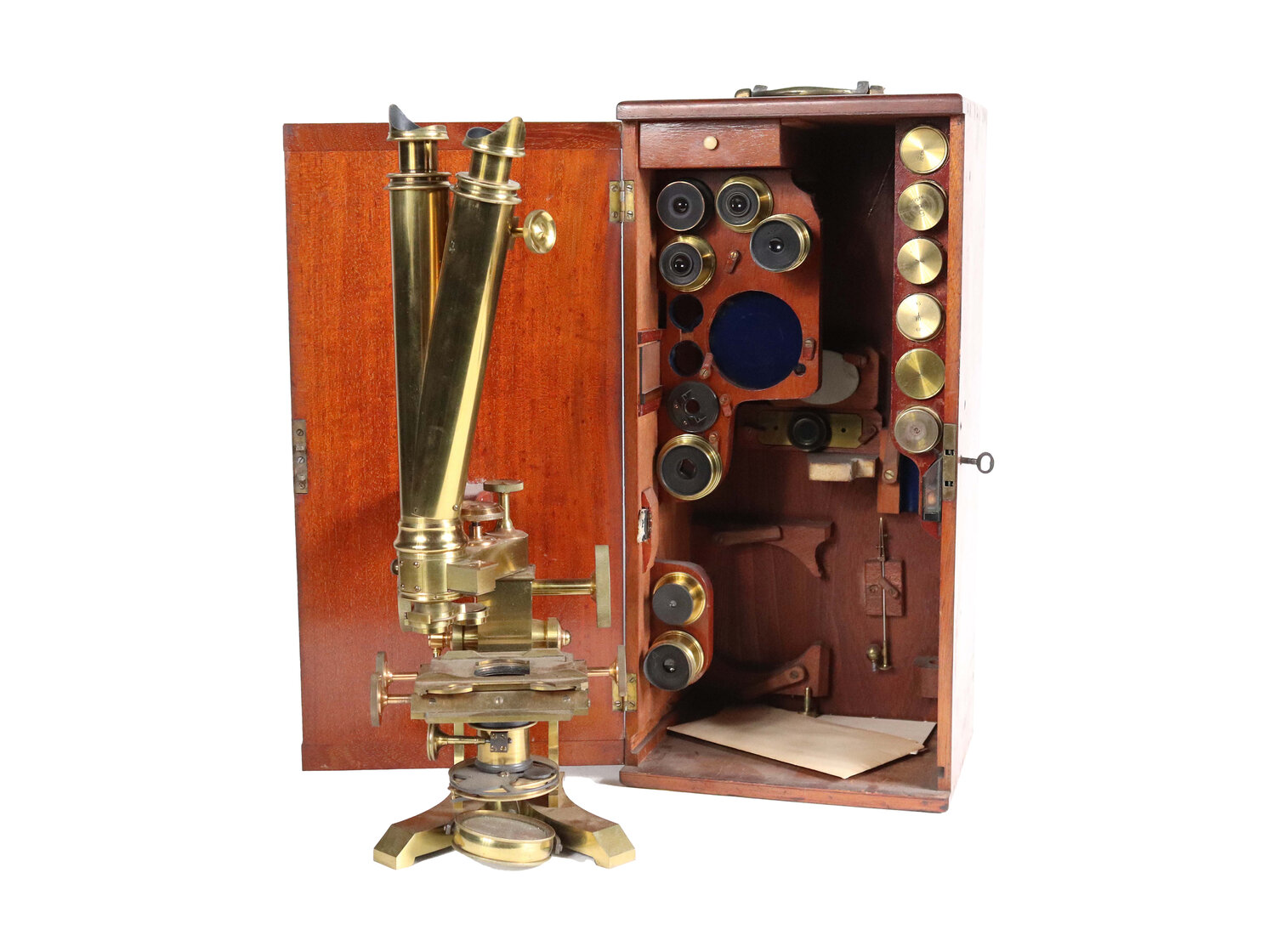Charles Collins cased binocular microscope, engraved "C. Collins, Optician, 157 Great Portland Street, London", with mahogany box on stand and 1" objective lenses (estimate: $3,000-$5,000).