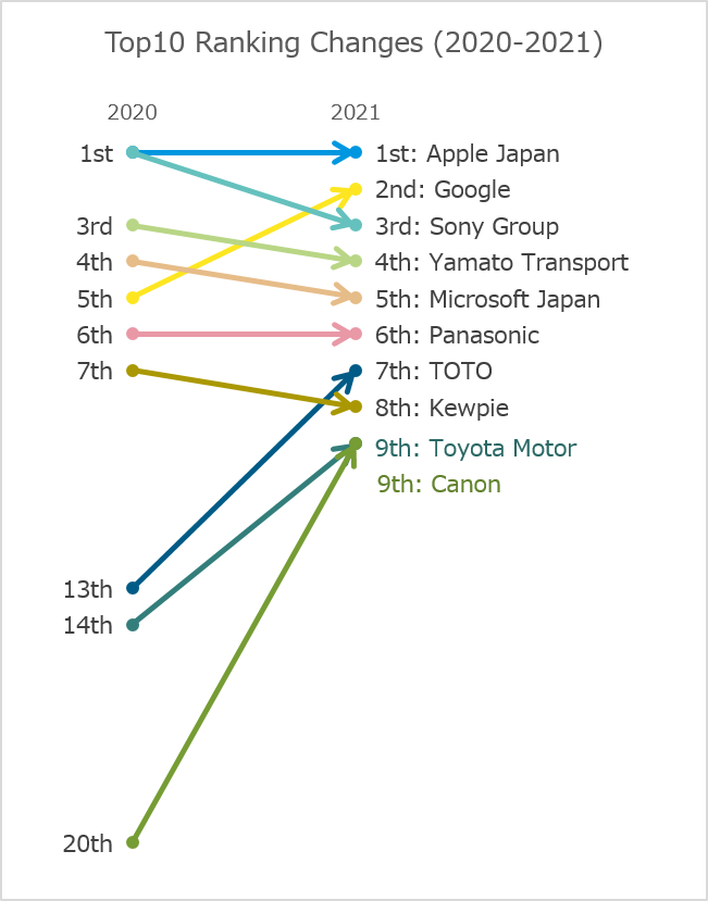 TOKYO, JAPAN, November 18, 2021 /EINPresswire.com/ -- Nikkei Research Inc. has released its Brand Strategy Survey 2021, which evaluates the corporate brand equity of 600 major companies in Japan. This year, Apple Japan topped the list again, while Google came in second, moving up from its previous position in fifth place. Other names at the top of the list were familiar from last year, although TOTO, Toyota Motor and Canon all made significant gains in the rankings and moved into the top 10.The overall rankings are based on the Brand Perception Quotient (PQ), our original measure of corporate brand equity formulated with the following five key indicators: