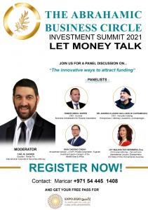 DUBAI, UNITED ARAB EMIRATES, November 15, 2021 /EINPresswire.com/ -- The Abrahamic Business Circle’s Investment Summit 2021 theme this year, LET MONEY TALK, will be held on Wednesday, 8th of December, 2021 at TAJ, Dubai. The program starts at 10 am and ends at 6 pm and which followed by Post-networking Cocktail.