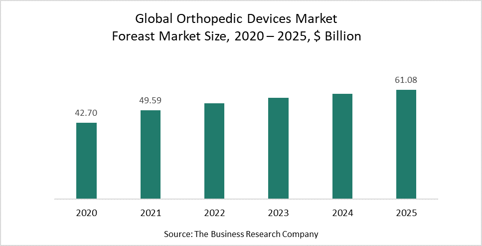 The global orthopedic devices market size is expected to grow from $42.70 billion in 2020 to $49.59 billion in 2021 at a compound annual growth rate (CAGR) of 16.1%. The growth of the orthopedic devices market is mainly due to the companies rearranging their operations and recovering from the COVID-19 impact, which had earlier led to restrictive containment measures involving social distancing, remote working, and the closure of commercial activities that resulted in operational challenges. The orthopedic devices market is expected to reach $61.08 billion in 2025 at a CAGR of 5%.