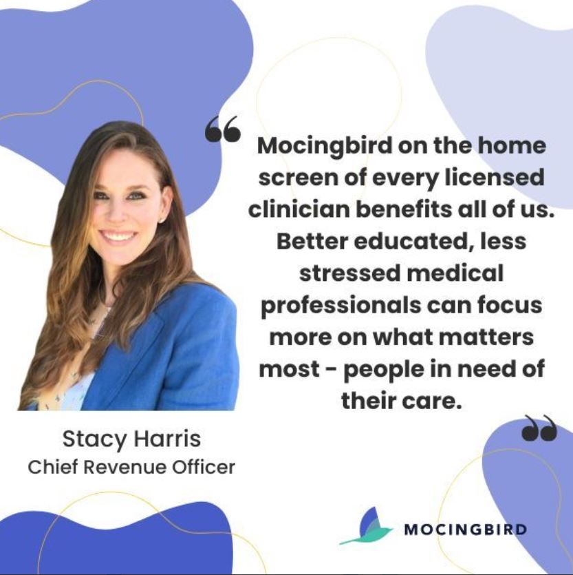 "I'm thrilled that Stacy's impact and opportunity are expanding in her new role as CRO of Mocingbird. The combination of Stacy's passion to drive positive change for providers in healthcare along with her unique ability to develop relationships at all levels makes her a perfect fit,” said Brad Artery, Mocingbird CEO. “Watch out as Stacy and our incredible Mocingbird team continue to challenge the status quo and drive positive change for healthcare professionals."