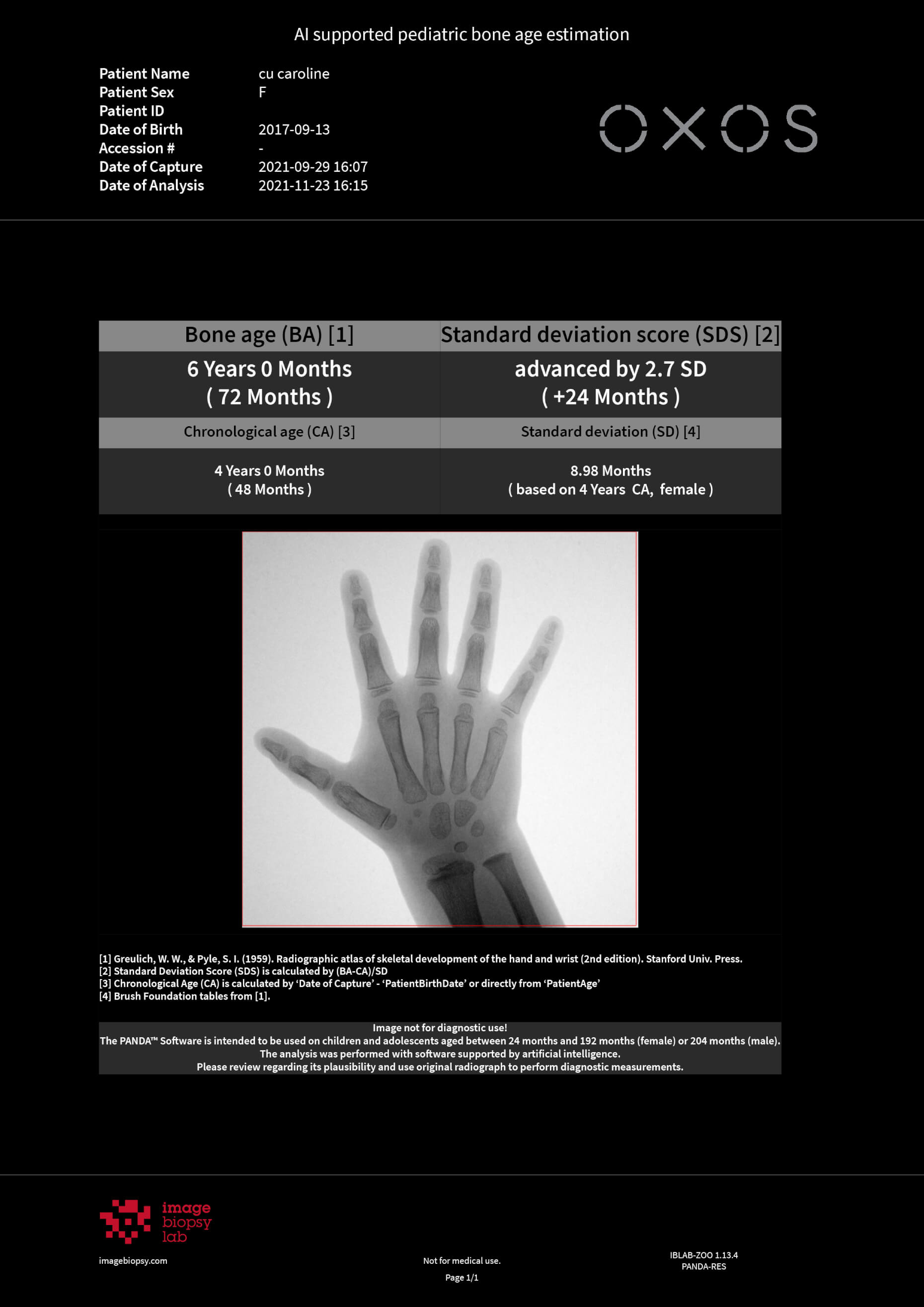 IB Lab PANDA uses deep learning technology to report bone age based on the Greulich & Pyle scale and provides automated results within 5 seconds. IB Lab PANDA’s automated bone age estimates are accurate within 5.4 months.