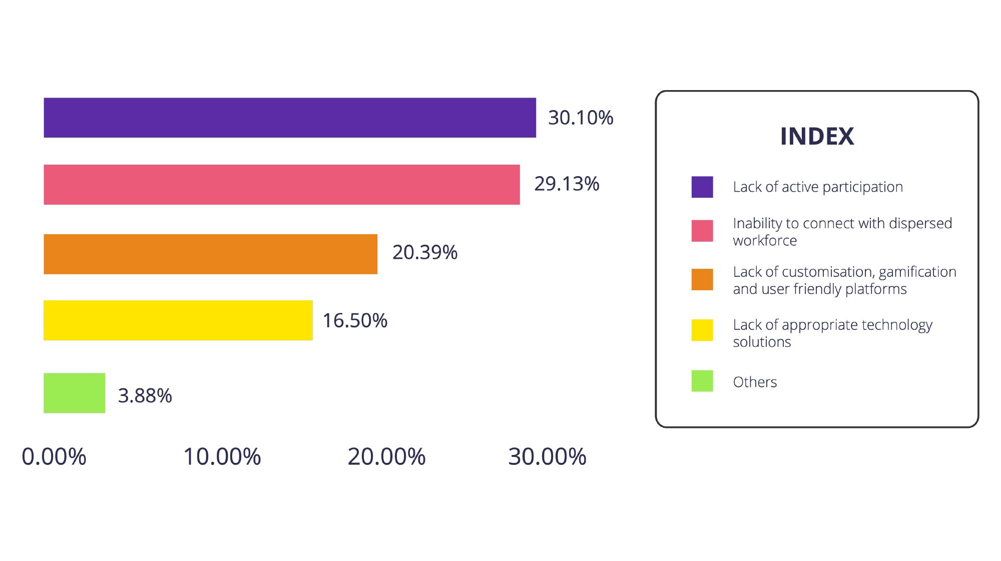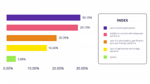 This Corporate Wellness study highlighted numerous components of the wellness strategy implementation process. The first and most important rule is to identify the roadblocks to a successful wellness program. Amid obstacles like low participation, inadequate funds, 38% of respondents considered lack of gamification and technology-driven solutions to be the major challenge while carrying out digital wellness programs.
