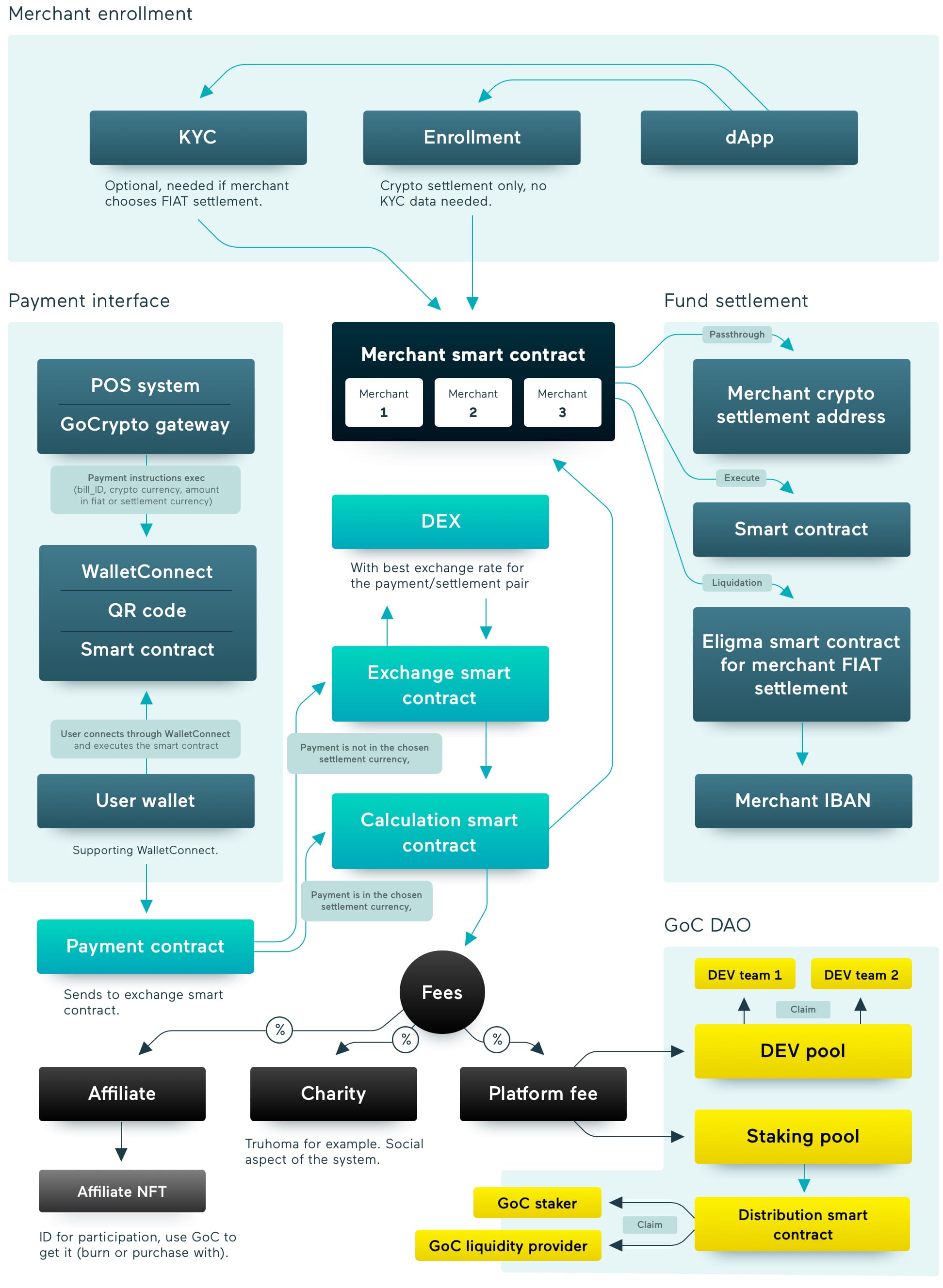 Below is the description of the payment flow. The Merchant POS system generates a QR code with instructions for the smart contract through the GoCrypto Gateway. Client with his compatible wallet scans the QR code and approves the transactions. The funds are then taken from the client wallet and routed either through a DEX or directly into the merchant settlement account. A fee for the service is deducted automatically before the funds hit the merchant smart contract. How the fee is later distributed can be adjusted as the project progresses. At first, the fee distribution would be determined by the GoCrypto project as the creator of the solution but if the governance is later transferred to a GoC DAO, then the stakeholders (GoC holders, developers, etc.) will be able to vote on the fee distribution.