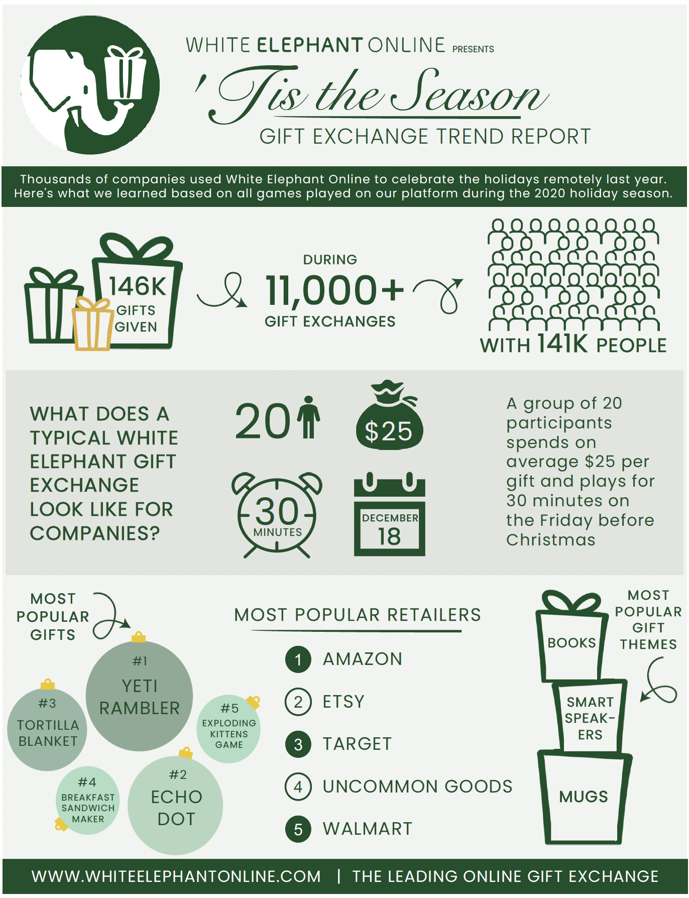 Last season, thousands of companies used White Elephant Online to celebrate the holidays remotely. With over 11,000 games played on the platform and over 146,000 gifts exchanged during the 2020 holiday season, White Elephant Online’s Tis the Season Gift Exchange Trend Report sheds light on interesting gift-giving trends and how companies celebrate the holidays.
