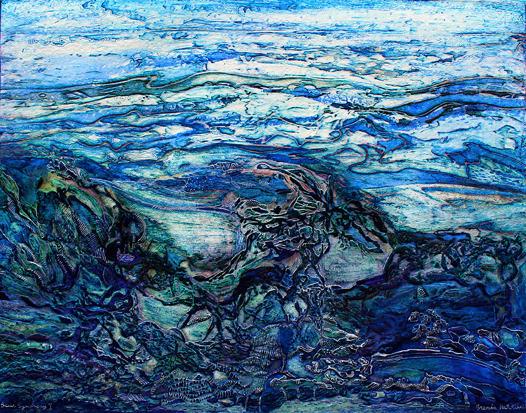 Recent works include a series of watercolor paintings with collagraph embossing. In addition, Brenda Hartill has developed a method of inking using the different plate levels, mixing primary colors on the plate, thus producing a shimmer of color. Her work develops through the materials he uses. Her ongoing fascination is with erosion, weather patterns, natural textures, growth formations, and universal organic forms.