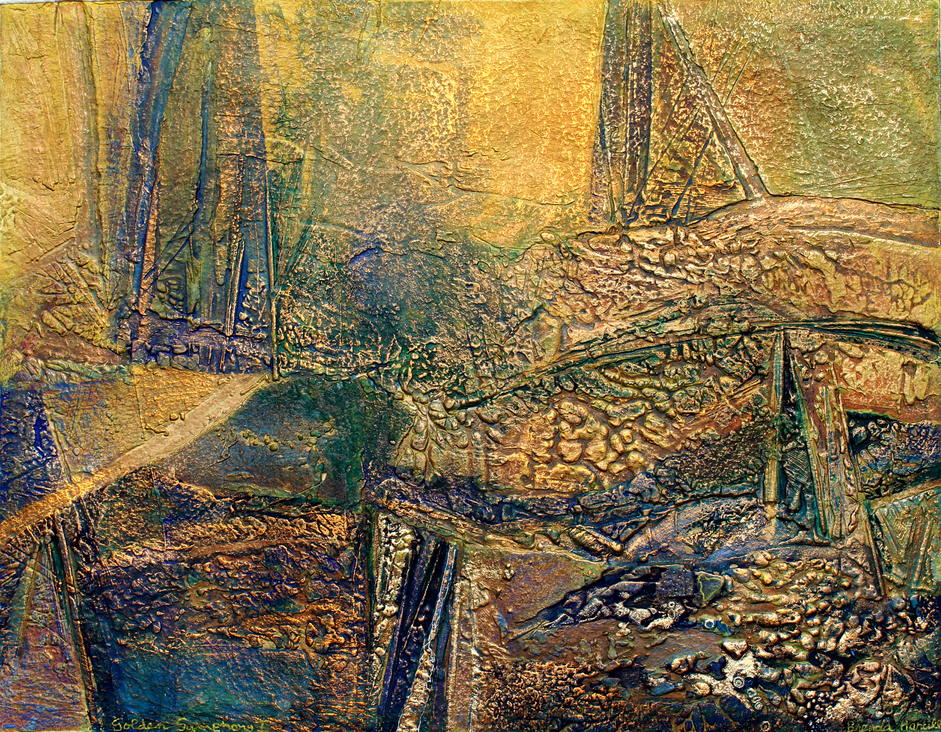 Brenda Hartill's work is experimental, abstract, and embossed. Collagraph, etching, watercolor, collage, and encaustic works. Her main love is abstracting the essence of the landscape in richly colored textured works, often enhanced with silver and gold leaf.