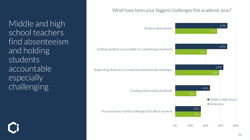However, major findings from the survey show that it is still a challenging time for teachers, specifically around supporting student social and emotional challenges, student absenteeism, and holding students accountable for completing school work. Additional findings include: