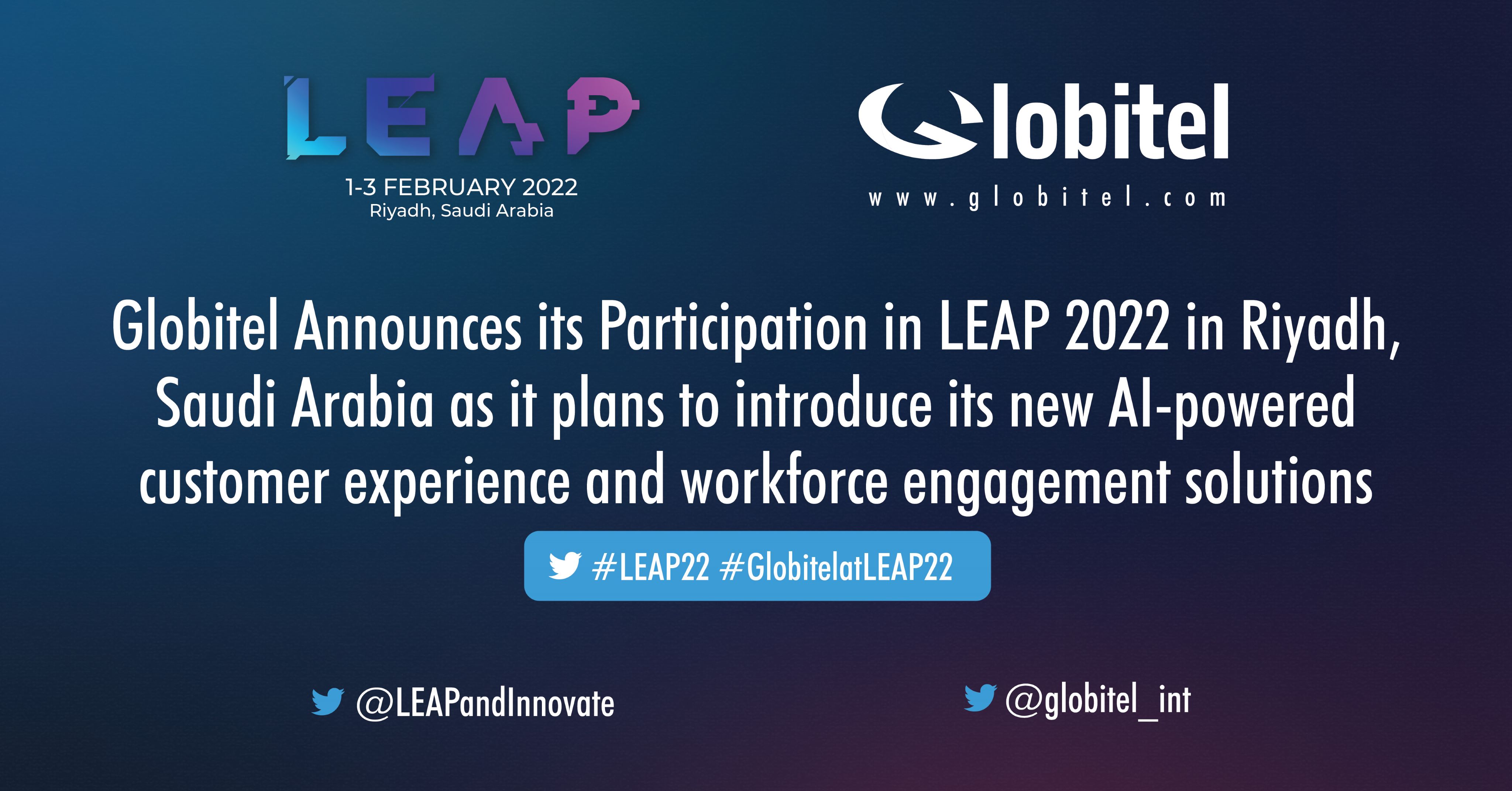 RIYADH, KSA, December 13, 2021 /EINPresswire.com/ -- Globitel is delighted to announce its participation in LEAP in Riyadh, Saudi Arabia from February 1st until February 3rd, 2022. Globitel is excited to introduce its new AI-Powered solutions at a one-of-a-kind event.