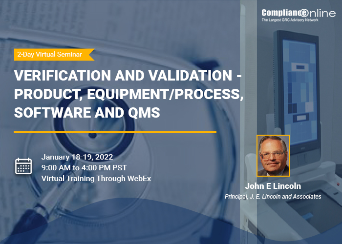SAN JOSE, CA, UNITED STATES, December 15, 2021 /EINPresswire.com/ -- ComplianceOnline, the leading provider of training for regulated companies, is hosting a two-day virtual seminar on Verification and Validation - Product, Equipment/Process, Software, and QMS. The Seminar to be held on January 18-19, 2022, will be presented by John E. Lincoln.