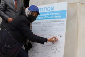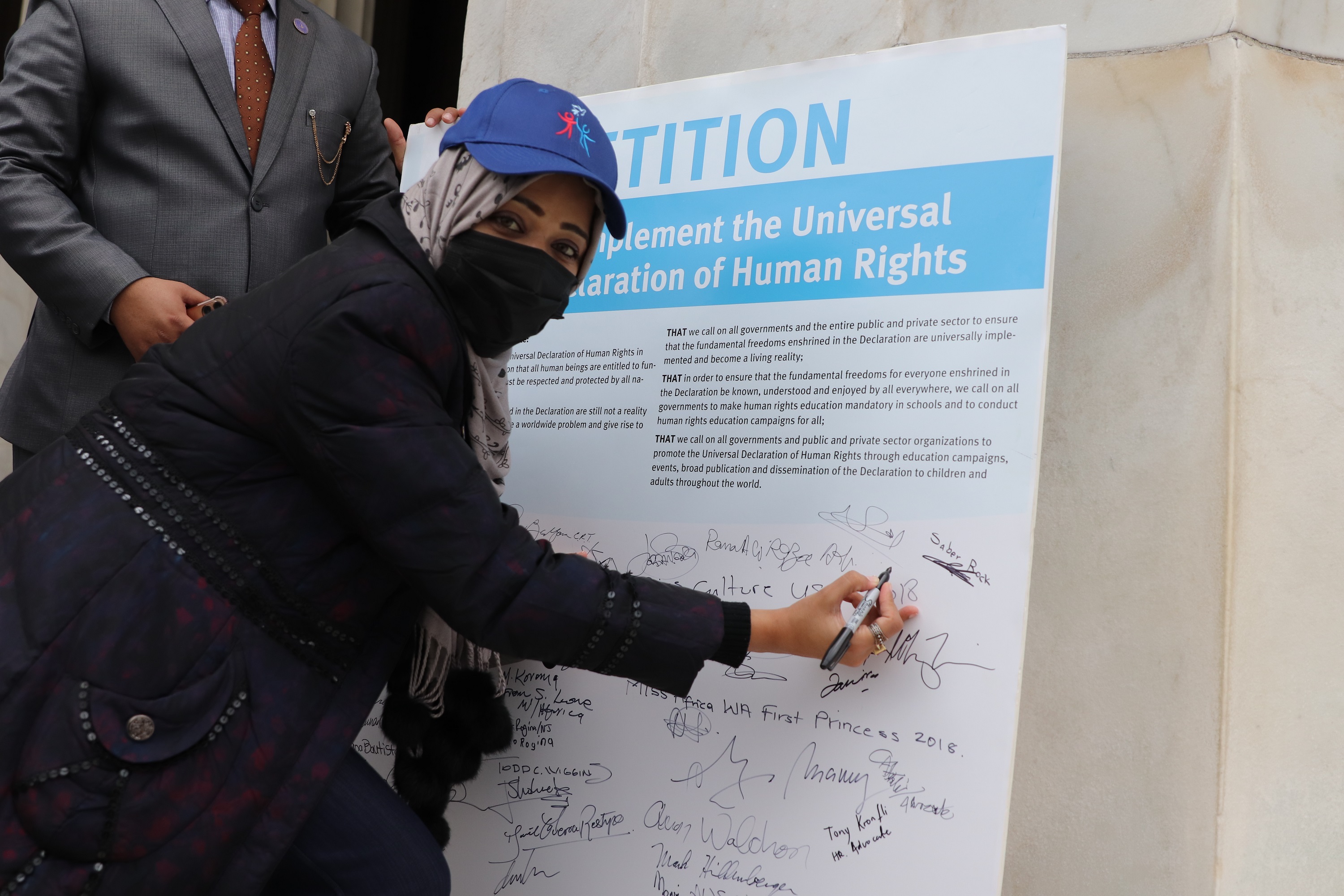 At Lincoln Memorial a woman who travelled from Pakistan signs the petition calling for the UN Universal Declaration of Human Rights to be required material in schools so that all people are educated in their human rights.