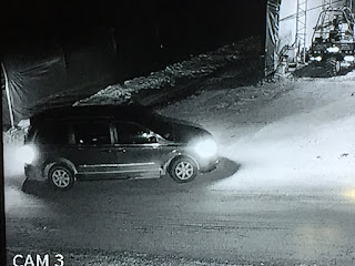 SUMMARY OF INCIDENT: Sometime on the night of 12/13/2021, a pallet of wood pellets was taken from a garage at the address above. Anyone with information about this incident is encouraged to call Trooper Johnson at the St. Johnsbury Barracks (802-748-3111). Vermont State Police received a still shot of the suspected vehicle involved in the burglary (attached to press release). The vehicle appeared to be a dark colored Chrysler Town and Country minivan.