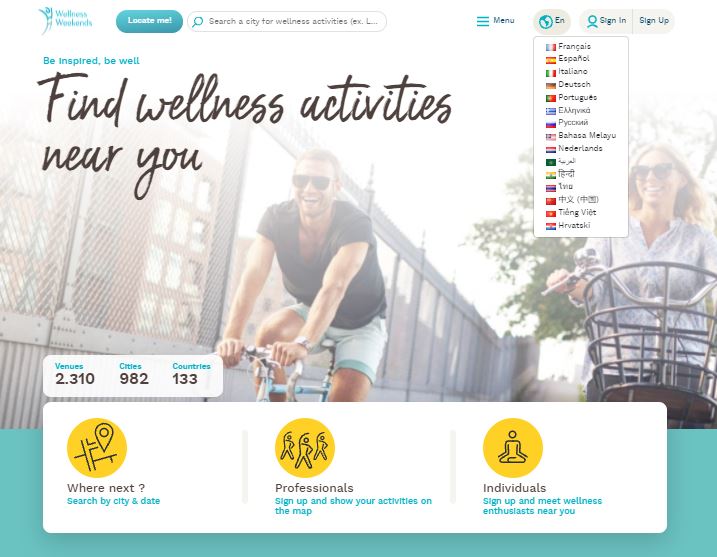 Available in 16 languages, wellmap.org enables the public to locate on any device 2,310 participating venues listed in 133 countries. This “World Wellness Map” helps wellness enthusiasts and “weekenders” find wellness professionals around the globe and around the corner for original activities, staycations, getaways, retreats and wellness weekends.