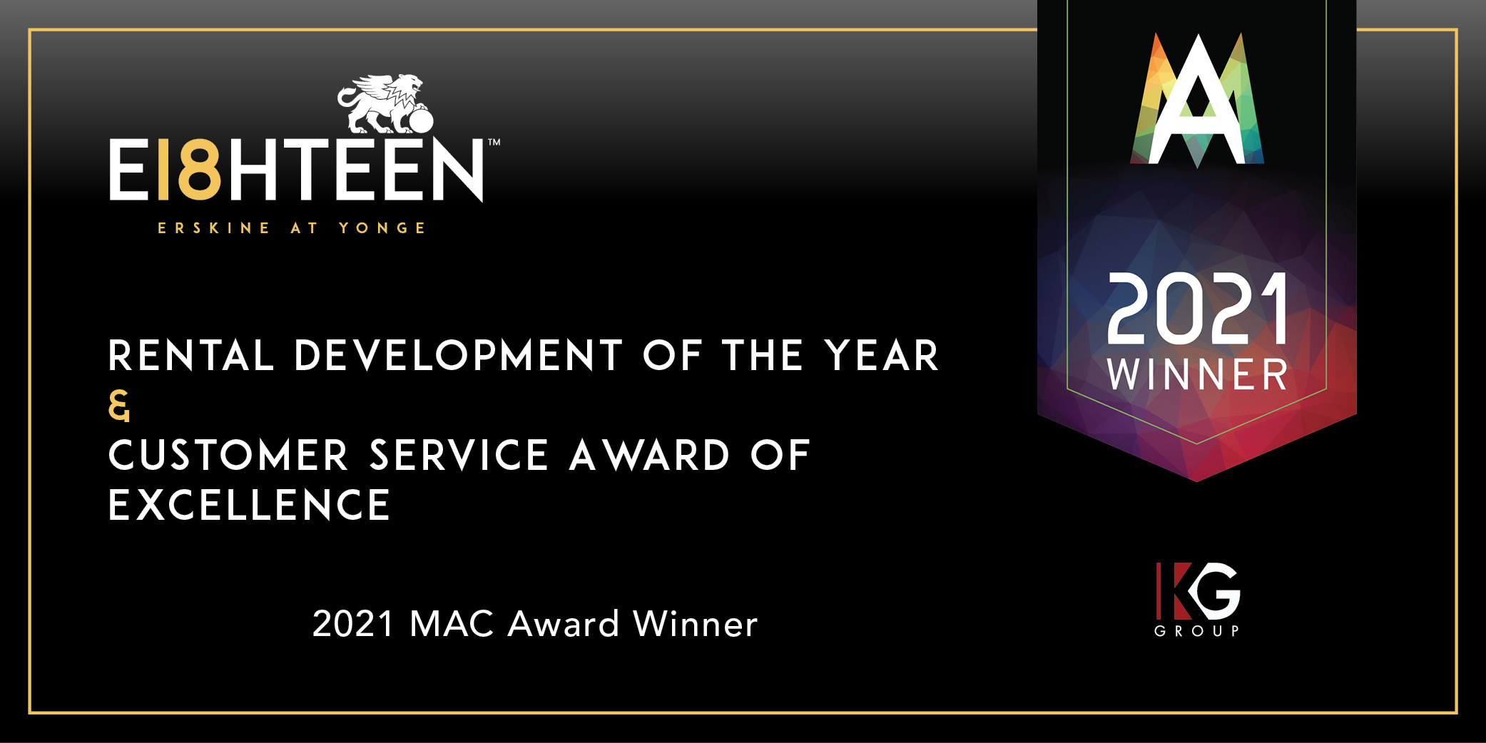 FRPO (Federation of Rental-housing Providers of Ontario) MAC Awards is the largest event of its kind in Canada, recognizing excellence in rental housing and honouring the leaders of the industry. KG Group’s 18 Erskine was selected from numerous entries, an acknowledgement of the community’s winning combination of luxury 5-star amenities and resident services in a superior location.