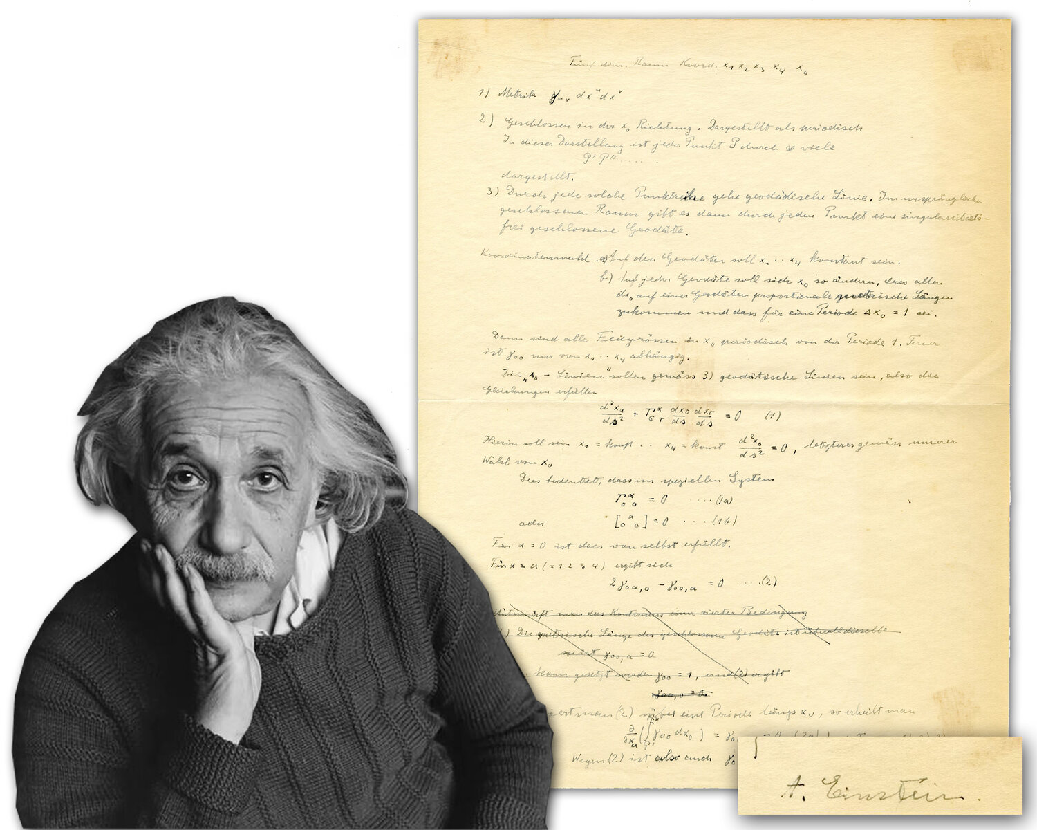 Manuscript handwritten in German by Albert Einstein circa 1938, with several lines of mathematical equations, signed at its conclusion “A. Einstein” (estimate: $40,000-$50,000).