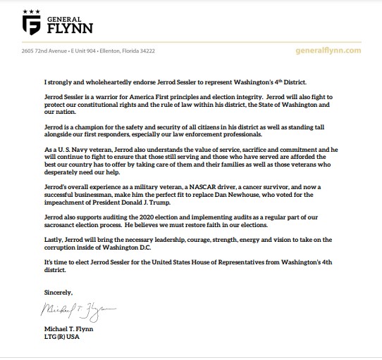Former Trump advisor, General Flynn, endorses Congressional candidate Jerrod Sessler for Congress.