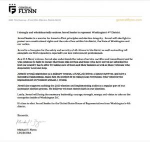 "I am deeply honored by the endorsement of LIEUTENANT GENERAL MICHAEL T FLYNN, a statesman and warrior, with a legacy of distinguished service spanning several Presidencies including the greatest President of our lifetimes, President Donald Trump. In our conversations, General Flynn told me his vision for America – a vision I share and will fight with every breath to see come to fulfillment. America will be well served by me and others that are going to DC with the armor of God and a plan to not just defend America but to mount an offense the likes of which our Republican Party has never seen before. I am humbled by the General’s validation of my positions on key issues, and his confidence in my ability to protect and defend the Constitutional rights of those in the fourth district of Washington State and our country.