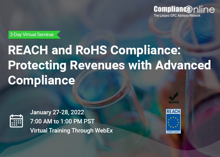 SAN JOSE, CA, UNITED STATES, December 29, 2021 /EINPresswire.com/ -- ComplianceOnline, the leading provider of training for regulated companies is hosting a 2-day virtual seminar on ‘REACH and RoHS Compliance: Protecting Revenues with Advanced Compliance.’ The January 27-28, 2022 seminar is led by Kelly Eisenhardt, Co-Founder and Managing Director at BlueCircle Advisors LLC.