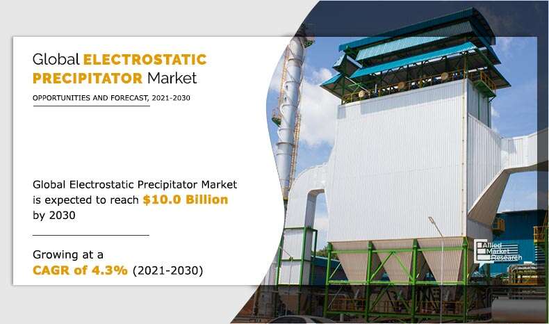 PORTLAND, OREGON, UNITED STATES, January 2, 2022/EINPresswire.com/ -- The global electrostatic precipitator market forecast was valued at $6.6 billion in 2020, and is projected to reach $10.0 billion by 2030, growing at a CAGR of 4.3% from 2021 to 2030. Electrostatic precipitator (electrostatic air cleaner) is a device that removes certain impurities such as solid particles or liquid droplets from air or gaseous stream. It uses electric charge to remove impurities coming out from smokestacks and other flues.The global electricity demand is increasing rapidly, which, in turn, has led the power generation sectors to maximize their power generation capacities. For instance, according to a report published by the Indian Ministry of Power, the electricity generation target from conventional sources for the year 2021-2022 is 1,356 billion unit (BU), which is a growth of around 9.83% as compared to 2020-2021. This has led conventional sources-based power plants such as coal-fired and gas-based power plants to witness a significant growth, wherein electrostatic precipitator is widely used for soot and ash removal purposes from the exhaust gas. In addition, these power plants are connected with the rigorous government regulation for upholding the requirement for keeping particulate matter emissions within standard limits. This is anticipated to increase the sale of electrostatic precipitators among coal-fired and gas-fired power plants, thus creating remunerative opportunities for the market.