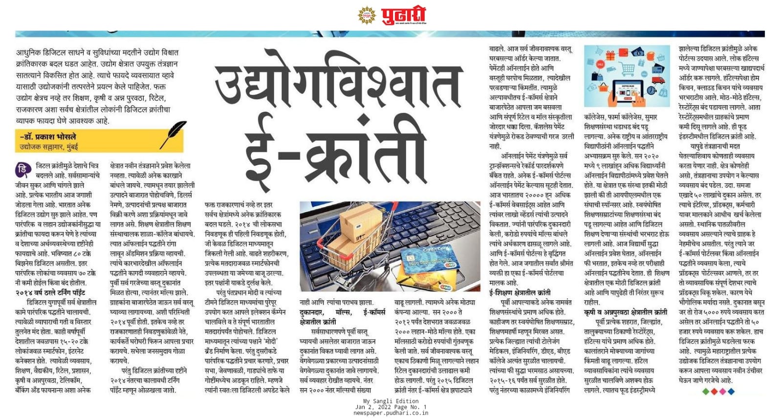 In this special supplement, many eminent writers and experts have written very informative articles on Digital India, Digital Business, eCommerce and Digital Lifestyle. In this Dr. Prakash Bhosale, columnist & CEO of BBG eBranding Group, Hon'ble Shri. Nitin Gadkari, Union Minister for Land Transport, Shri. N. R. Narayan Murthy, Founder of Infosys, Shri. Apramey Radhakrishna, Co-Founder &CEO-Koo App, Shri. Prakash Javadekar, Former Union Minister, Dr. Yogesh Jadhav, Group Editor - Daily Pudhari, Shri. Ranjit Singh Disale, Global Teacher) and many other dignitaries have shared their views and thoughts in their writings in this special edition.