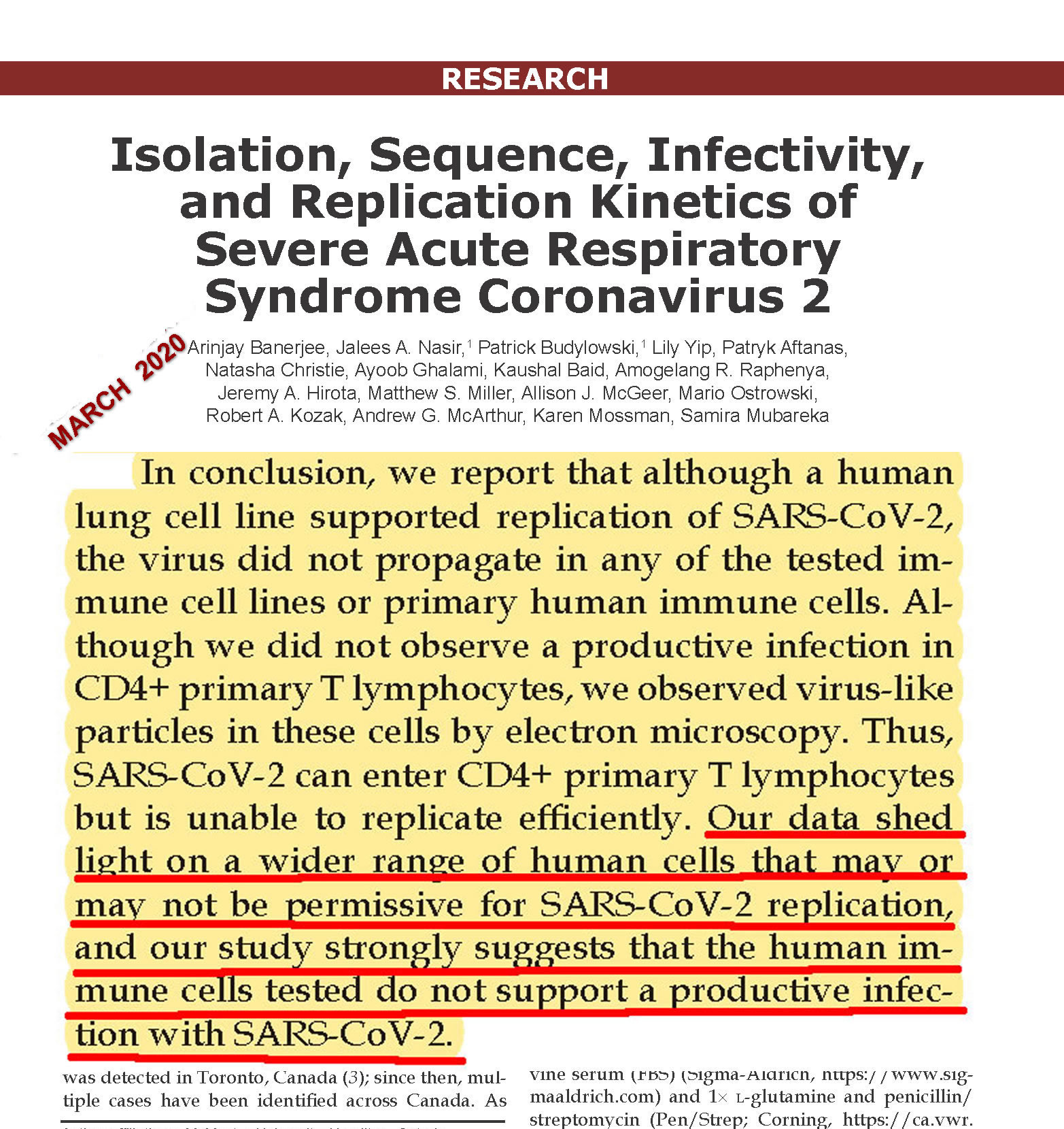 Les scientifiques canadiens ont indiqué dès le départ dans leur documentation que l'isolement du virus « suggère fortement que les cellules immunitaires humaines testées ne permettent pas une infection productive ». En d'autres termes, selon la conclusion de l'isolement, le virus ne peut pas franchir les cellules saines du système immunitaire pour se multiplier et créer une infection. Ils ont également déclaré que le virus est identique à 80 % au SRAS, mais qu'il s'agit d'une variante plus bénigne.