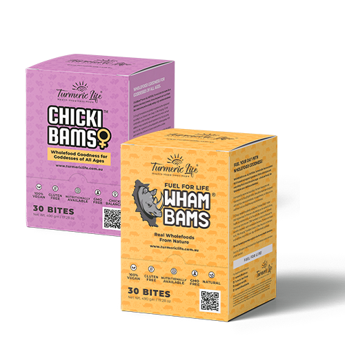 To help get you through the 30 Day Turmeric Challenge, we suggest getting some Turmeric Life ChickiBam Bites pack of 30. These super tasty delights are convenient, just chuck them in your bag. The best part is the taste . . they have a hint of delicious berries, with the ever-important turmeric and curcumin hidden by a delightful punch of cacao. The choc-berry brownie bites are 100% plant-based vegan, gluten-free and GMO-free. If you like something a little more spicey you can try the WhamBam Bites pack of 30.